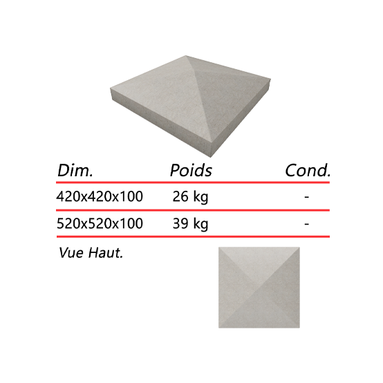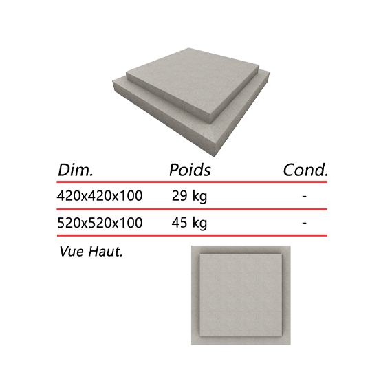 Dimensions : 420x420x100 Poids : 26kg Dimension : 520x520x100 Poids : 39kg Classe : Type : Chapeaux